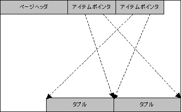 タプルが格納されるにつき、ページヘッダの後に4バイトのアイテムデータ(アイテムポインタ)が格納されます。タプルはページの後方から格納されていきます。