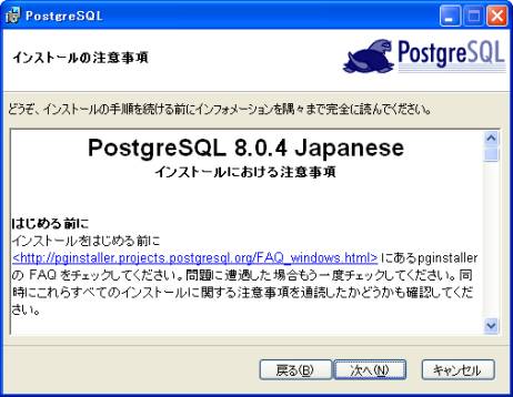 postgresql-8.0-ja.msiというインストーラがあるのでダブルクリックします。すると以下の画面が表示されます。