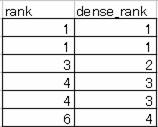 この違いは非常に簡単で、ランク付けの方法が異なるだけです。ランク付けは、一位が2レコード存在する場合、その次のレコードのランクを3とするランク付けが、rankです。