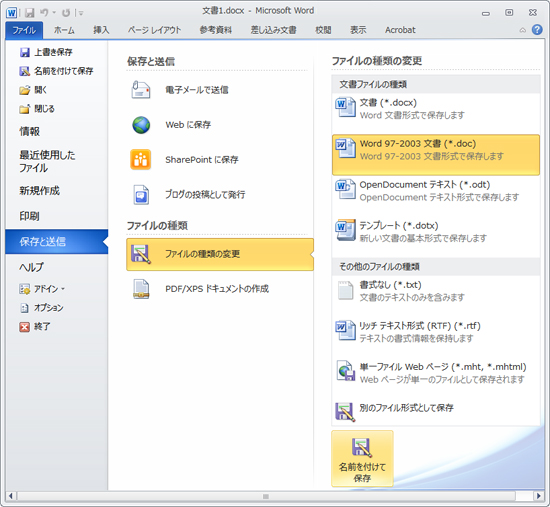 [保存と送信]の[ファイルの種類の変更]の[Word97-2003]をクリックします。