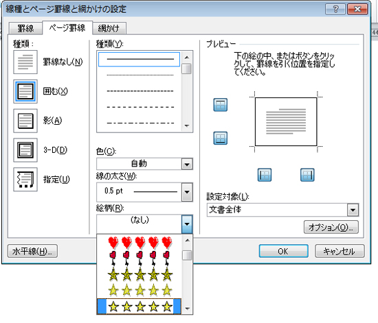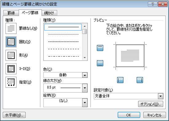 [線種とページ罫線と網掛けの設定]ダイアログが表示されるので[ページ罫線]タブをクリックします。