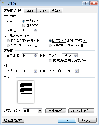 「ページ設定」ダイアログが表示されました。 [文字数と行数]タブになっていることを確認します。 [文字数と行数を指定する]にチェックを付け、[文字数]と[行数]を設定します。 [OK]ボタンをクリックします。